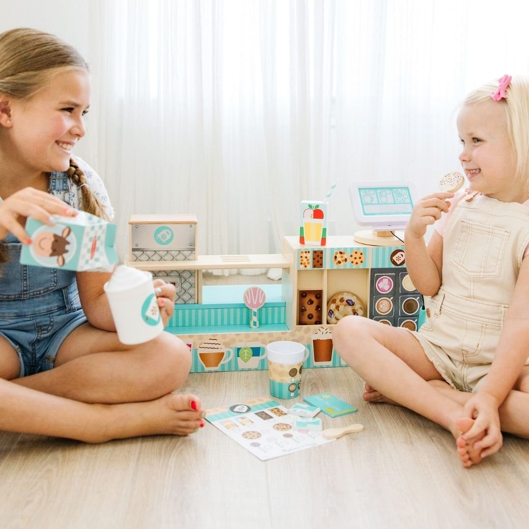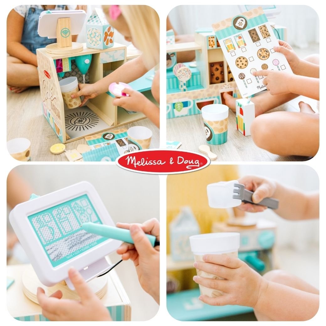 - Add to the pretend play experience with durable cup and mug, whipped cream topping, milk carton, ice tongs, 2 ice cubes, wooden spoon, wooden sign magnets, a reusable, double-sided menu, credit card, and reusable loyalty card