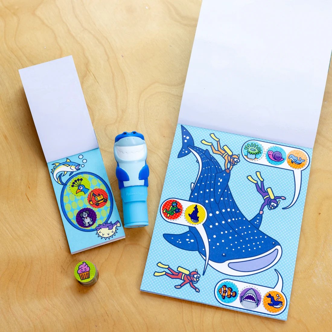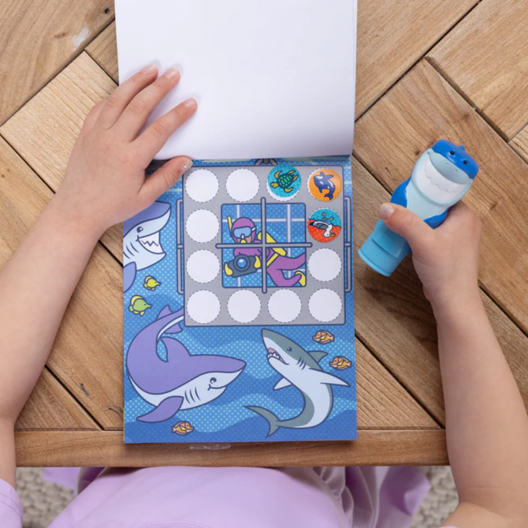 A Whole New Way to Play with Stickers - Collectible toy stamper dispenses ocean-themed stickers on the 24-page Shark activity pad and other creative art projects, no peeling required!